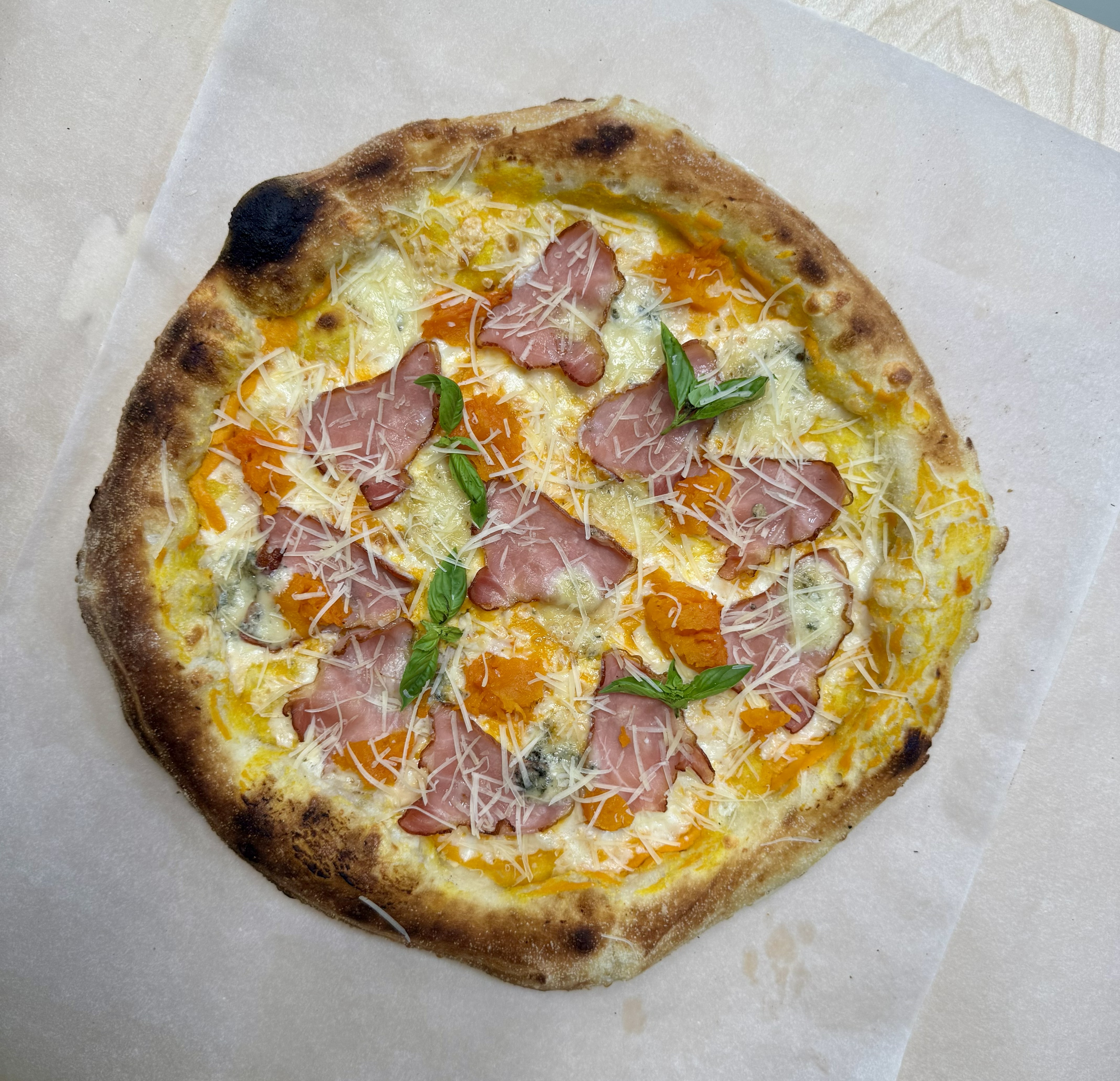 Тыквенный соус со сливками, сыр моцарелла, карбонад свиной, печёная тыква, сыр дорблю, пармезан, базилик, оливковое масло.
