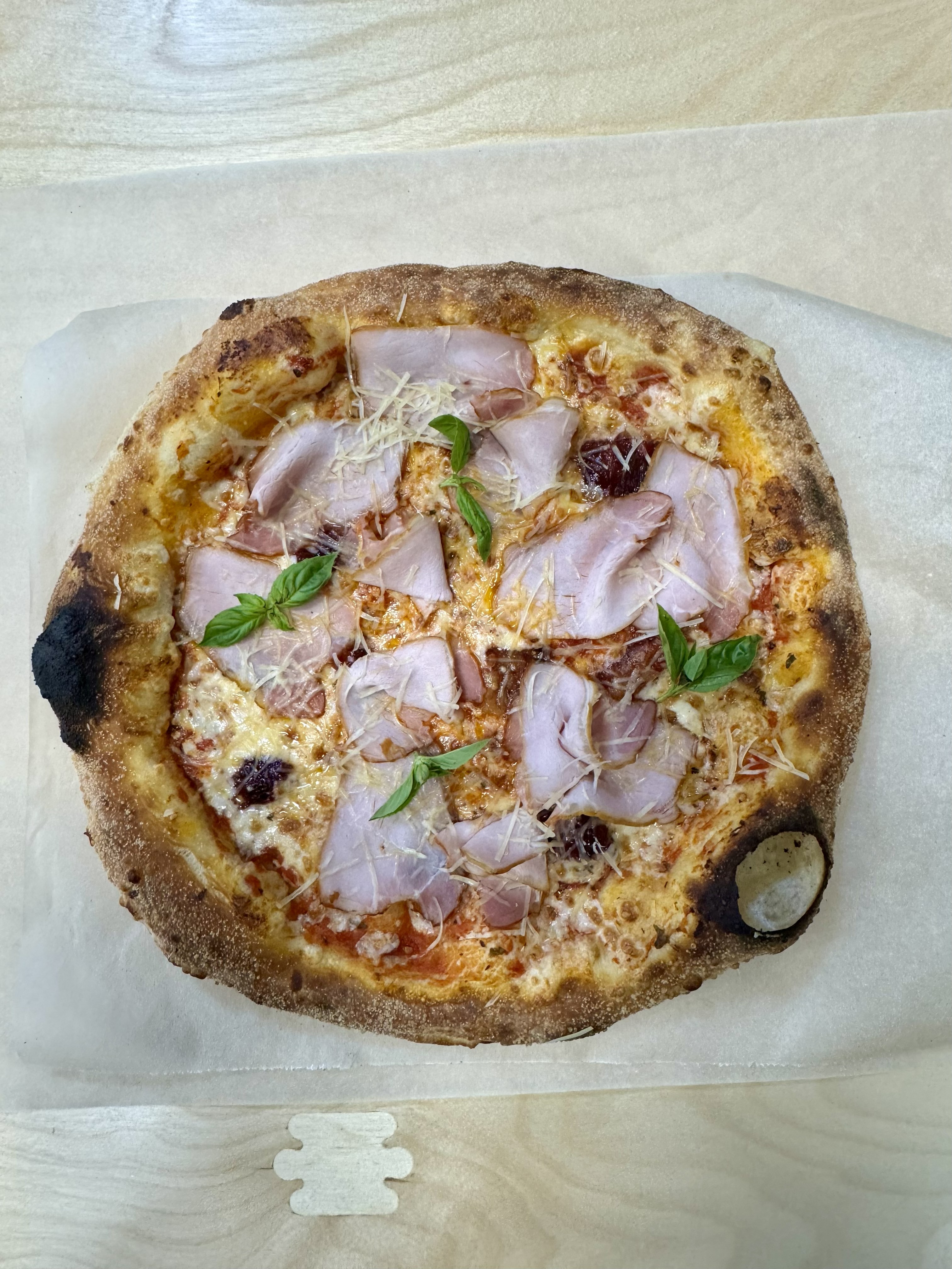 Тесто для пиццы Бруклин, томатный соус, моцарелла и ветчина из индейки собственного производства, печеный перец, соус медовая горчица, пармезан, базилик, оливковое масло.