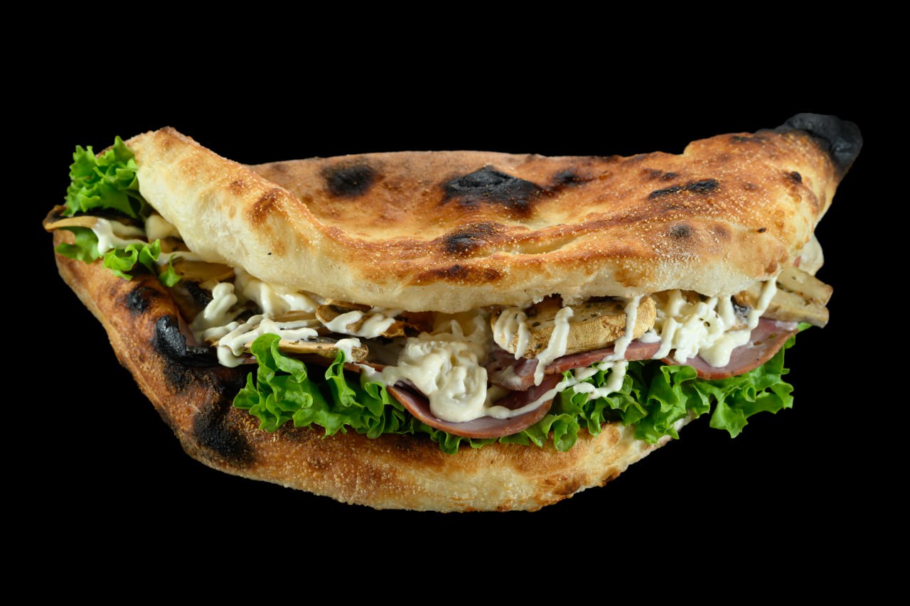 Соус Айоли, куриная ветчина, печёный помидор, лист салата, сыр моцарелла, сыр страчателла, чесночное масло.
