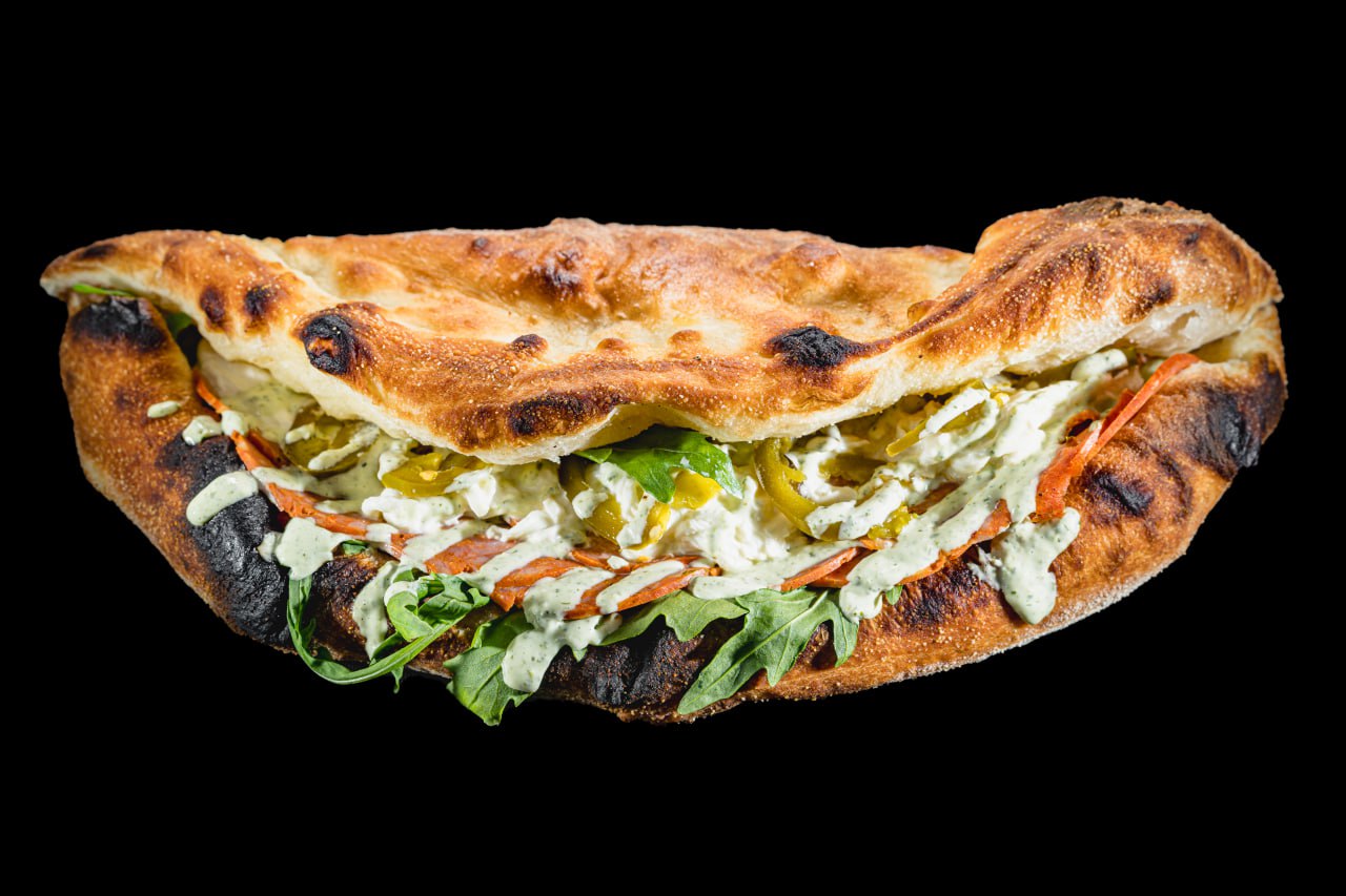 Соус Айоли с зеленью, колбаса папричоза, руккола, перец халапеньо, сыр чеддер, сыр страчателла, чесночное масло.